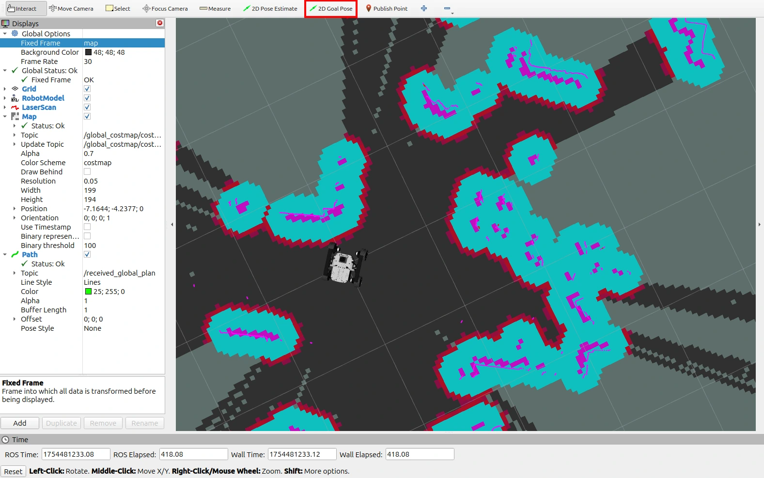 Provided you clicked on a valid position, the robot should start moving towards the goal. The path should now be visible in RViz2, and the robot should follow it.